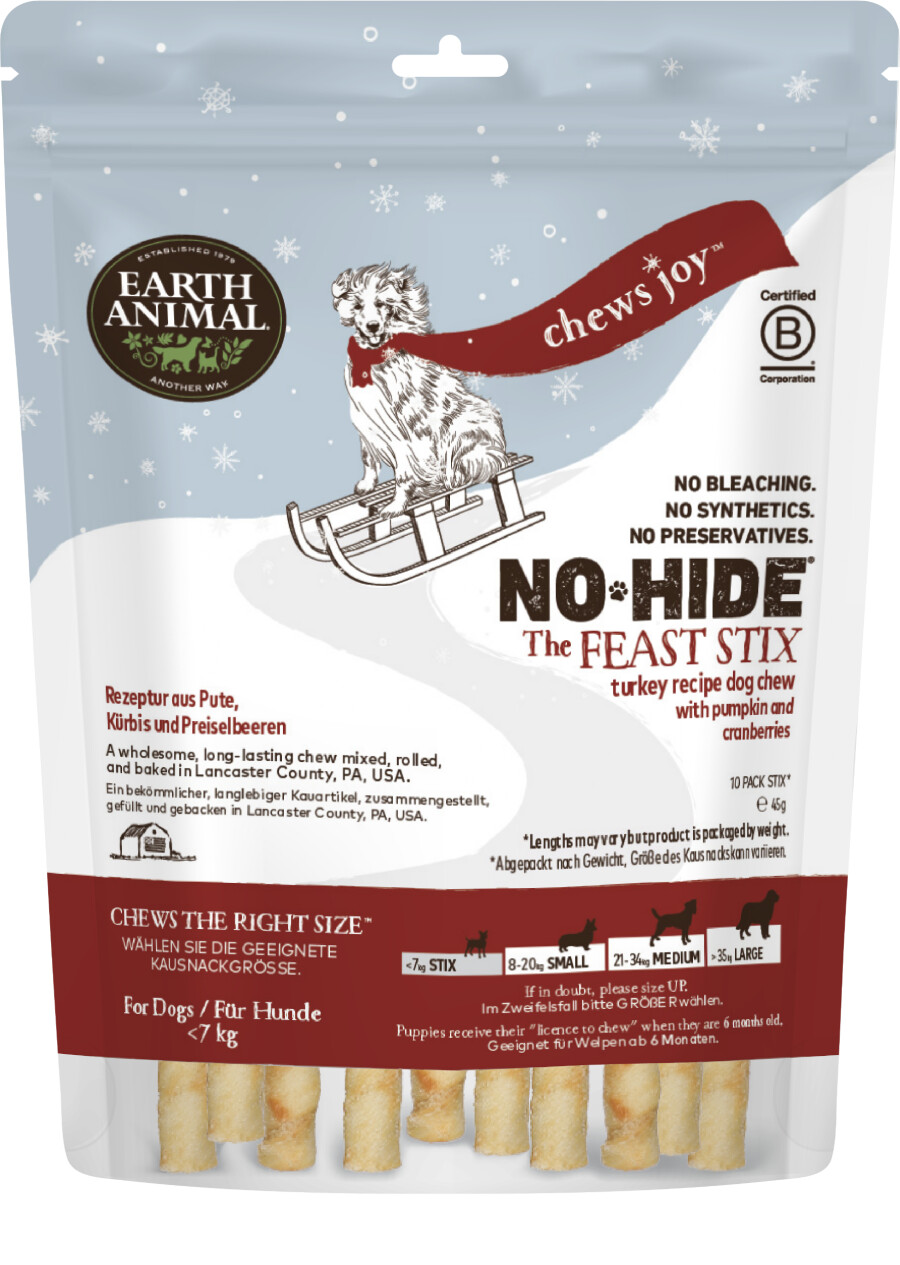 Earth Animal NO-HIDE žvečke v omejeni božični izdaji THE FEAST XMAS so naravne, lahko prebavljive in izjemno okusne žvečljivke, ki podpirajo zobno higieno ter sproščanje psa. Izdelane so brez kemikalij, aditivov in belil, zato predstavljajo varno in kakovostno izbiro za praznično razvajanje vašega ljubljenčka.